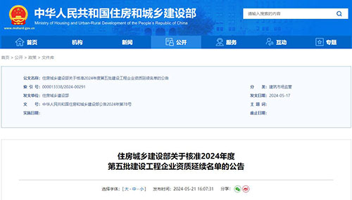 近日,住建部發(fā)布關(guān)于核準(zhǔn)2024年度第五批建設(shè)工程企業(yè)資質(zhì)延續(xù)名單的公告。