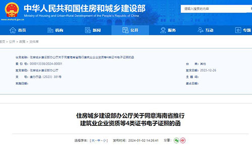 近日,住房城鄉建設部公開發函,批復同意海南省對省級權限內的建筑業企業、工程監理、工程勘察、工程設計等4類資質證書推行電子證照。