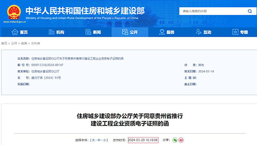 《關于申請推行建設工程企業資質電子證照的請示》(黔建呈〔2024〕15號)收悉。經研究,同意貴州省推行建筑業企業、工程監理企業、工程勘察企業、工程設計企業等4類建設工程企業資質電子證照。