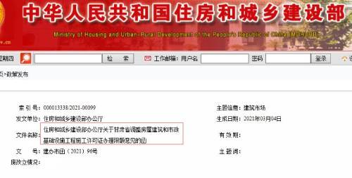 《關于申請調整甘肅省房屋建筑和市政基礎設施工程施工許可證辦理限額的請示》(甘建辦〔2021〕44號)收悉。