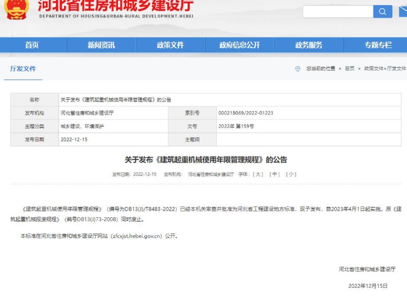 近日,河北省住房和城鄉建設廳發布了新修訂的《建筑起重機械使用年限管理規程》,自2023年4月1日起實施,同時廢止原《建筑起重機械報廢規程》。
