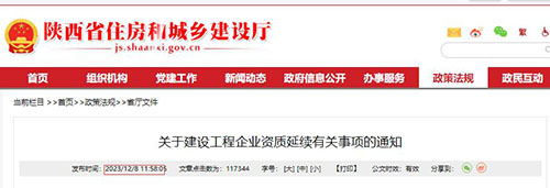 12月8日,陜西省住建廳發布了關于建設工程企業資質延續的通知,明確:資質有效期于2024年12月31日前屆滿的,統一延期至2024年12月31日。